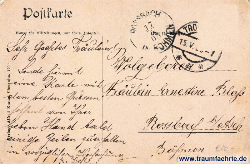 Beschriftung hinten: Postkarte, (Raum für Mitteilungen, nur für's Inland.), Verlag: Alfred Kratze, Chemnitz. 190[…]