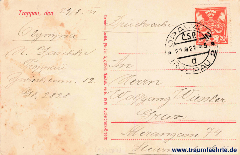 Beschriftung hinten: Troppau, den … Hermann Seibt, Meißen 2,2,6584 Nachdr. verb. 1918 Kupferdruck-Ersatz