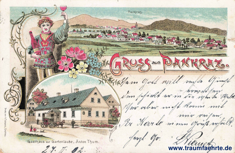 Inscription front: Gruss aus Pankraz. Pankraz. Gasthaus zur Gartenlaube, Anton Thum. Druck von A. Tschark, Grottau.