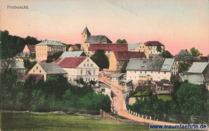 nachkolorierte Schwarzweißfotografie – Panorama von Proboscht / Proboštov mit Straße, Häusern und Johanneskirche mit Kirchturm und Turmuhr, davor Wiese, Holzzaun und Bäume, links hinten Wald