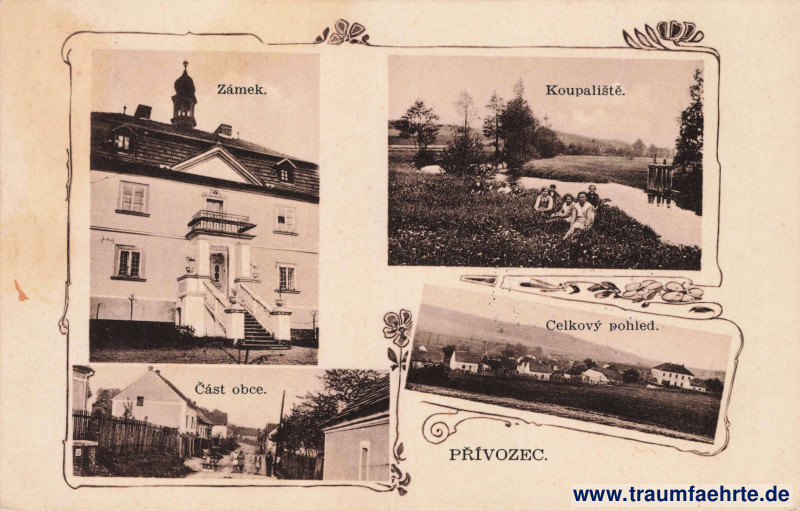 dark sepia-coloured monochrome photograph with four views – 1.) small castle with stairs and tower, 2.) group photo in front of swimming area with river, meadow, and trees, 3.) group picture on village street with houses and wooden fences, 4.) panorama of Přívozec with houses and meadow, hills in the background