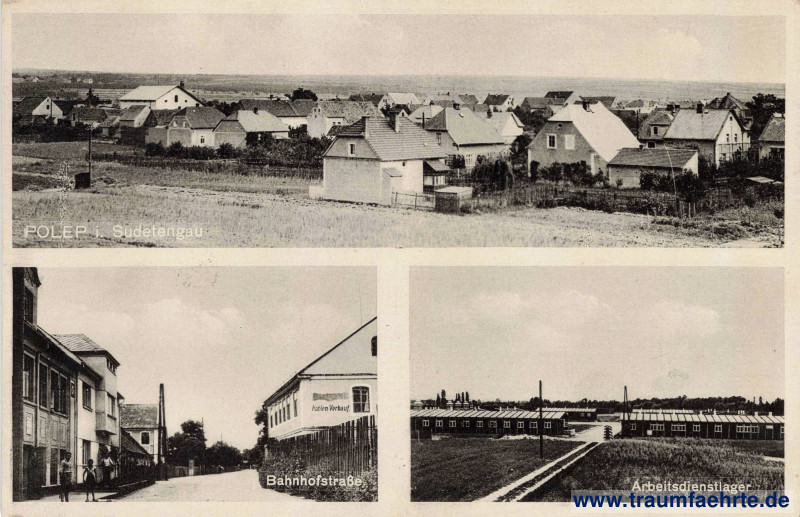 graue Schwarzweißfotografie mit drei Ansichten – 1.) Panorama Polep / Polepy mit Häusern, Holzzäunen, Strommast und Wiese, 2.) Bahnhofstraße mit Personen, Holzzaun, Kohlenverkauf und weiteren Gebäuden, 3.) ehemaliges NS-Reichsarbeitsdienstlager (RADwj) im Osten der Stadt mit Barracken, Masten, Wachhäuschen und Barracken – Stand Januar 2026 bieten wir ebenfalls ein privates Fotoalbum aus dem Lager an: Link.