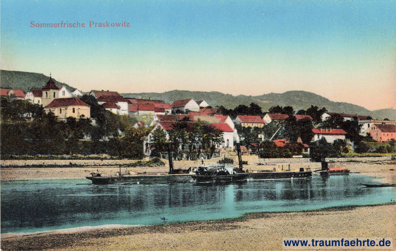 nachkolorierte Schwarzweißfotografie – Elbe / Labe mit Dampfschiff, dahinter Panorama von Praskowitz / Prackovice nad Labem mit Matthäuskirche / Kostel svatého Matouše samt Kirchturm, Elbehotel mit Terrasse und weiteren Häusern, Hügel der Böhmischen Schweiz im Hintergrund