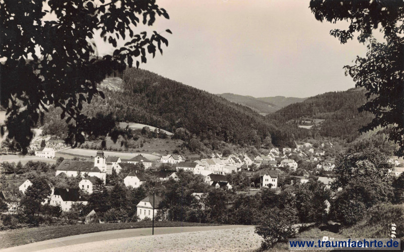 dunkelgraue Schwarzweißfotografie – Tal, Panorama von Pürstein / Perštejn mit Kirche, umgeben von bewaldeten Hügeln