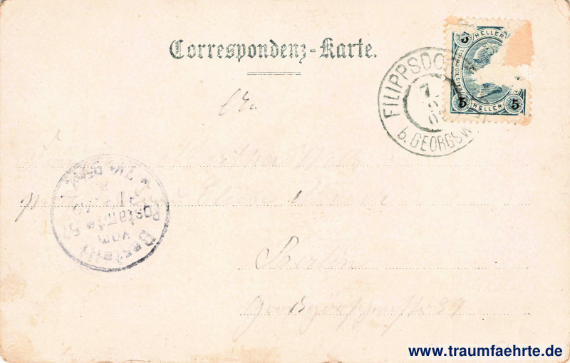 – Details – Jahr: ca. 1900 Status: gelaufen 1902, Briefmarke beschädigt Beschriftung vorne: Philippsdorf, Berühmtester Wallfahrtsort Nordböhmens, Verlag F. Wanke, Georgswalde, 2788 Ges. gesch. Beschriftung hinten: Correspondenz-Karte. … Stempel: Filipsdorf b. Georgswalde, 7 9 02; Bestellt vom Postamte 57, […]02, a Hinweis: