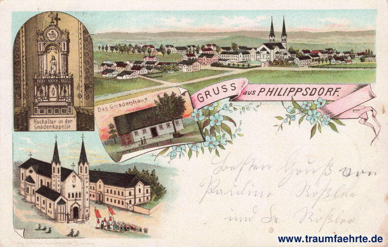 Beschriftung vorne: Gruss aus Philippsdorf. Hochaltar in der Gnadenkapelle. Das Gnadenhaus. Franz Schemm, Kunstanstalt, Nürnberg.