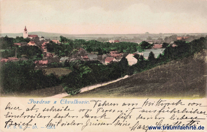 Beschriftung vorne: Pozdrav z Chvalkovic. F. B. K. – 59. – 1901