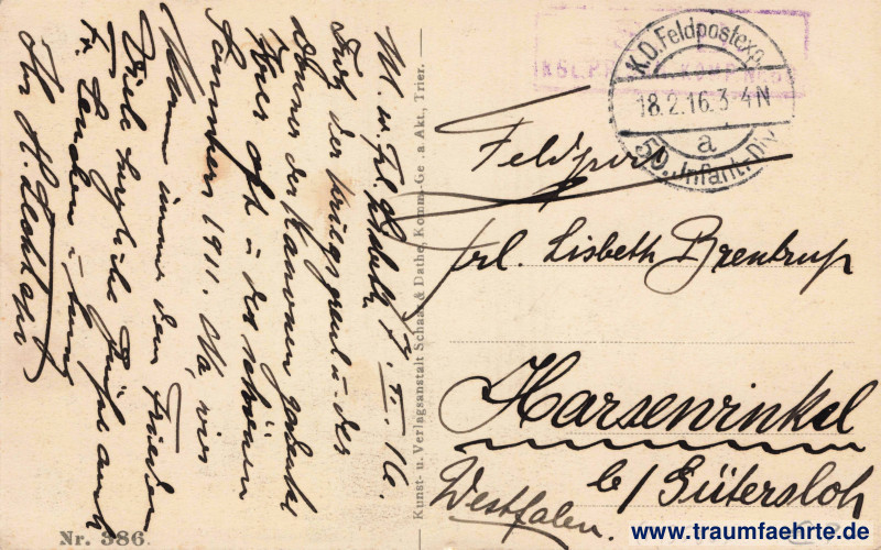 Stempel: K.D. Feldpostexp., 50. Infanstr.-Div., a, 18.2.16.3–4N; S. B. Kgl. Pr[…]komp. Nr. 5[0]