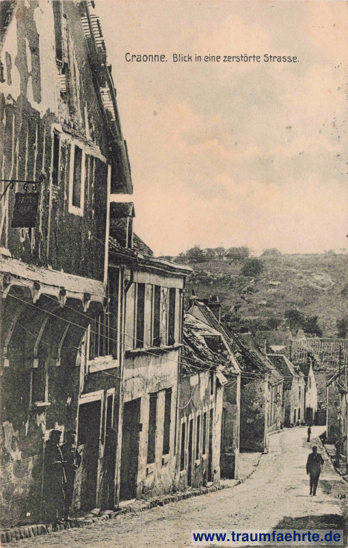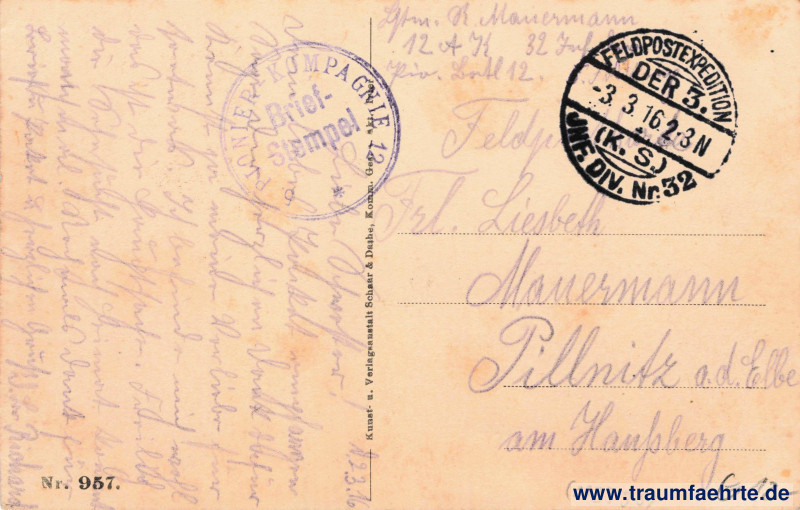 – Details – Year: ca. 1915 Postal state: postally used without stamp (military mail), 1916 Inscription front: Craonne. Blick in eine zerstörte Strasse. Inscription back: Nr. 957. Kunst- u. Verlagsanstalt Schaar & Dathe, Komm.-Ges. a. Akt., Trier Postmark(s): Feldpostexpedition der 3. (K. S.) Inf. Div, Nr. 32, –3.3.16.2–3N; Brief-Stempel, Pionier-Kompagnie 12 Please note: