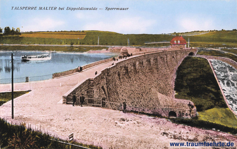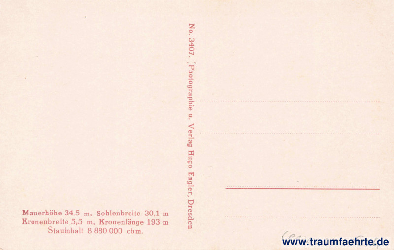– Details – Year: ca. 1920 Postal state: postally unused Inscription front: Talsperre Malter bei Dippoldiswalde – Sperrmauer Inscription back: Np. 3407. Photographie u. Verlag Hugo Engler, Dresden, Mauerhöhe 34,5 m, Sohlenbreite 30,1 m, Kronenbreite 5,5 m, Kronenlänge 193 m, Stauinhalt 8 880 000 cbm. Postmark(s): none Please note: