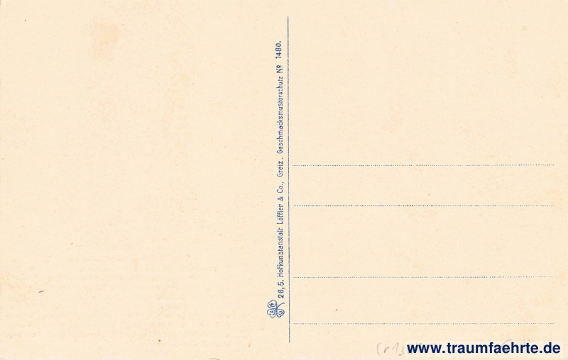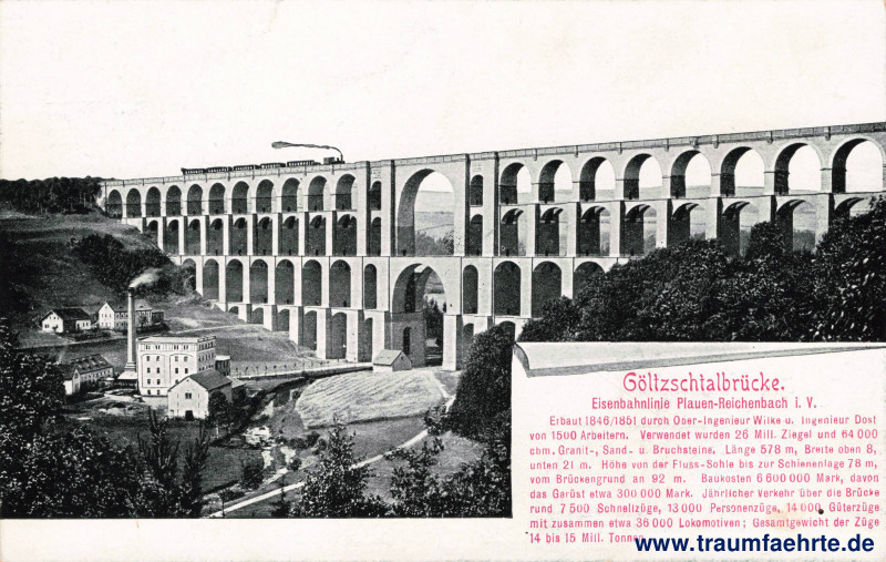 – Details – Year: ca. 1920 Postal state: postally unused Inscription front: Göltzschtalbrücke. Eisenbahnlinie Plauen–Reichenbach i. V. Erbaut 1846/1851 durch Ober-Ingenieur Wilke u. Ingenieur Dost von 1500 Arbeitern. Verwendet wurden 26 Mill. Ziegel und 64 000 cbm. Granit-, Sand- u. Bruchsteine. Länge 578 m, Breite oben 8, unten 21 m. Höhe von der Fluss-Sohle bis zur Schienenlage 78 m, vom Brückengrund an 92 m. Baukosten 6 600 000 Mark, davon das Gerüst etwa 300 000 Mark. Jährlicher Verkehr über die Brücke rund 7 500 Schnellzüge, 13 000 Personenzüge, 14 000 Güterzüge mit zusammen etwa 36 000 Lokomotiven; Gesamtgewicht der Züge 14 bis 15 Mill. Tonnen. Inscription back: L & Co G, 26,5. Hofkunstanstalt Löffler & Co., Greiz. Geschmacksmusterschutz No. 1480. Postmark(s): none Please note: