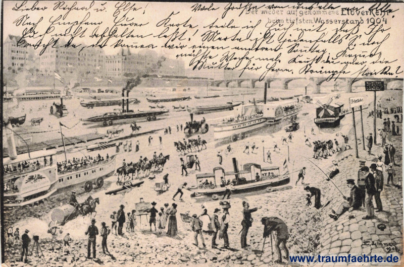Inscription front: Der wieder aufgenommene Elbverkehr beim tiefsten Wasserstand 1904, E. Zimmer 1904. Das Werfen mit Steinen in die Elbe ist verboten! Ueberfahrt