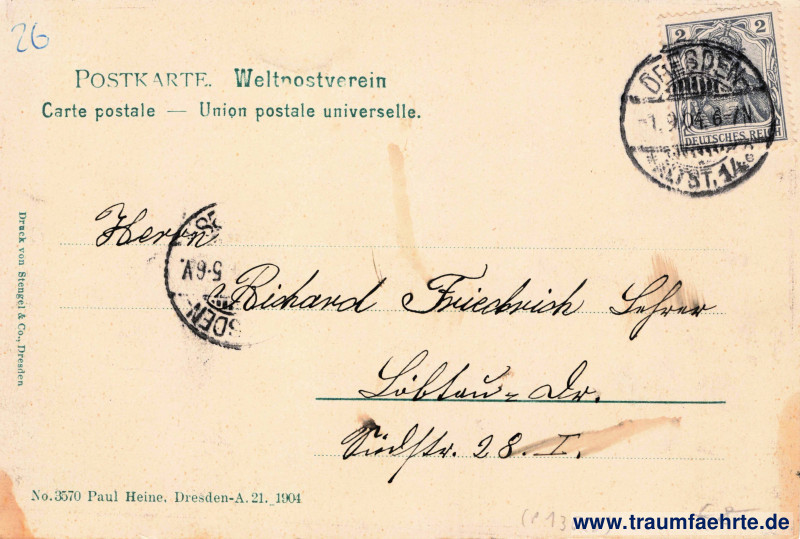 Inscription back: Postkarte. Weltpostverein, Carte postale – Union postale universelle. No. 3570 Paul Heine, Dresden-A. 21. 1904. Druck von Stengel & Co., Dresden