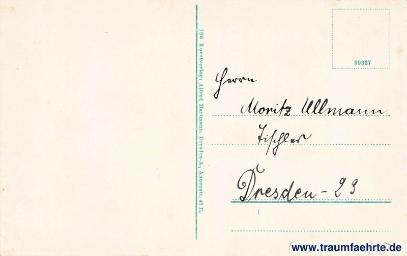 Inscription back: 186 Kunstverlag: Alfred Hartmann, Dresden-A., Annenstr. 48 II, 99327