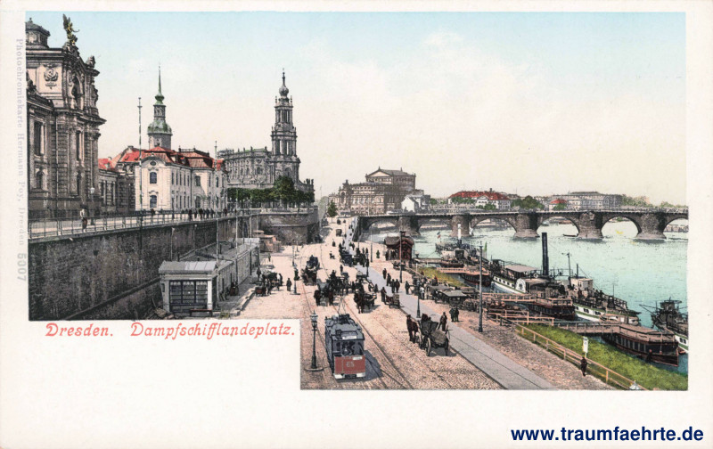 coloured – Terrassenufer street with tracks, tram, carriages, lanterns, poles, pedestrians, Elbe / Labe riverbank with landing place and Saxon steamships, Brühl's Terrace with trees to the left, in the background towers of castle, and Hofkirche church, Semper's opera house and Augustusbrücke bridge