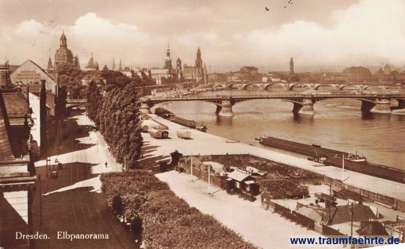 sepia-coloured photograph – Elbe / Labe river with ships, first Carolabrücke bridge and Augustusbrücke bridge, Terrassenufer alley with storage area, tram rails, carriages, lanterns, and pedestrians, Frauenkirche church, dome of academy of arts, towers of Schloss and Ständehaus (house of estates), Hofkirche church, Semper's opera house, tower of district heating plant, Yenidze