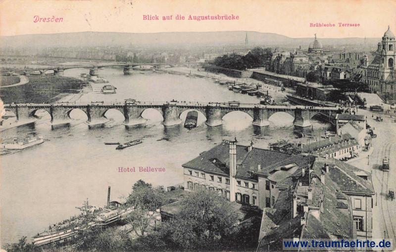 Inscription front: Dresden, Blick auf die Augustusbrücke, Brühlsche Terasse, Hotel Bellevue