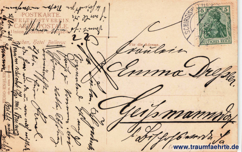 Inscription back: Postkarte. Weltpostveren. Carte postale. Union postale universelle. Dresden, Hotel Bellevue, Für die Adresse. Hugo Engler, Königl. Sächs. Hofphotogr.