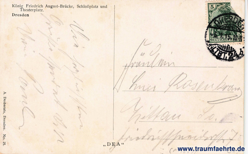 Inscription back: Dresden, König Friedrich August-Brücke, Schloßplatz und Theaterplatz, A. Desbarats, Dresden. No. 25. „D E A“