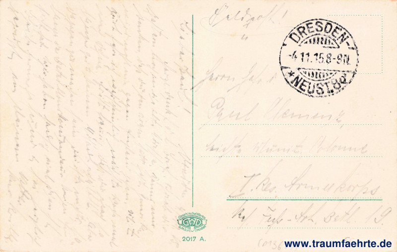 – Details – Year: unknown Postal state: postally used without stamp (military mail), 1915 Inscription front: Dresden. Ständehaus. Kgl. Schloss. Kath. Hofkirche. Zwinger. Inscription back: GWD Graphische Werke G.m.b.H. Dresden, 2017 A. Postmark(s): Dresden-Neust. 8, * d, –4.11.15.8–9N. Please note: