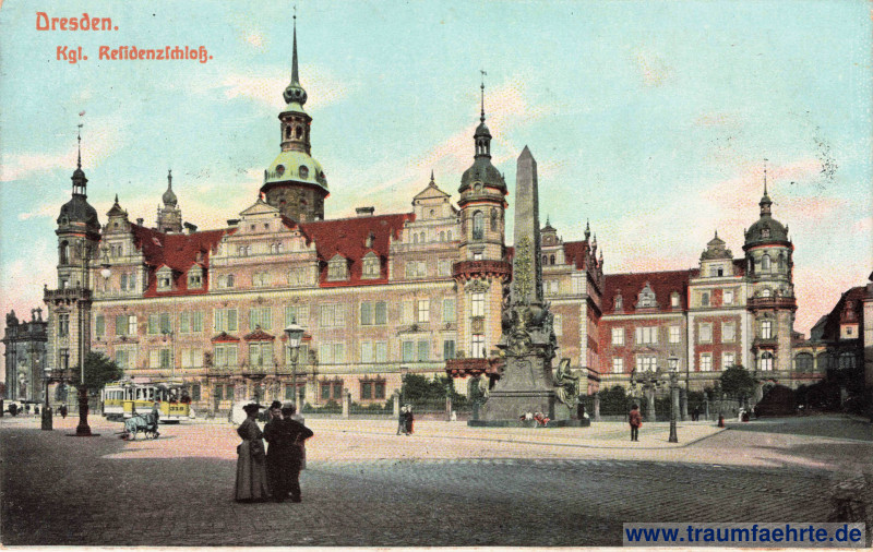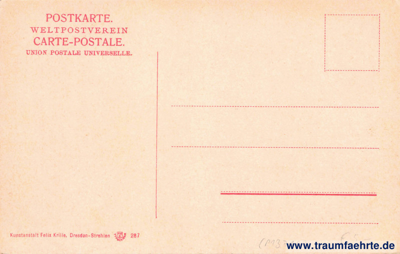 – Details – Year: ca. 1905 Postal state: postally unused Inscription front: Dresden. Kgl. Residenzschloß. Inscription back: Postkarte. Weltpostverein, Carte-posale. Union postale universelle. Kunstanstalt Felix Krille, Dresden-Strehlen, FKD Typochrom, 287 Postmark(s): none Please note: