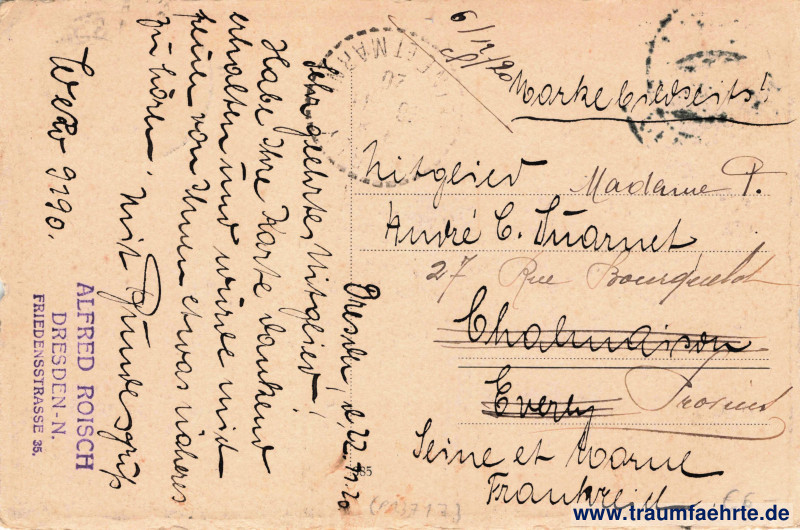 – Details – Year: ca. 1915 Postal state: postally used 1920, stamps on front side Inscription front: Dresden. Kgl. Schloss u. Wettin Obelisk. Inscription back: […]85 Postmark(s): 2x Dresden-Altst. 24, h, 23.11.20.11–12V.; […]; […] Seine et Marne, […] 20; Alfred Roisch, Dresden-N., Friedensstrasse 35 Please note:
