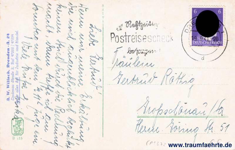 Postmark(s): Dresden-A 1, d, 19.9.41–20; Rechtzeitig Postreisescheck besorgen