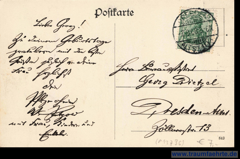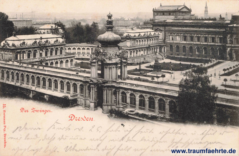 – Details – Jahr: ca. 1895 Status: gelaufen 1898 Beschriftung vorne: Dresden, Der Zwinger. 15. Hermann Poy, Dresden. Beschriftung hinten: Postkarte. Stempel: Dresden-Altstadt 1, a, 27.8.98. 4½–5 – V.; Augsburg, 27 Aug [98], 9–10 Nm. Hinweis: