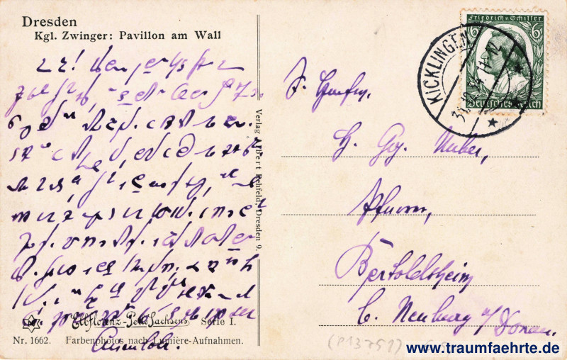 – Details – Year: ca. 1930 Postal state: postally used 1934 Inscription front: no text Inscription back: Dresden, Kgl. Zwinger: Pavillon am Wall, Elbflorenz-Perle Sachsens, Serie I. Nr. 1662. Farbenphotos nach Lumière-Aufnahmen. Verlag von Albert Rehfeld, Dresden 9. Postmark(s): Kicklingen, * * *, 31.12.34. 11–12 Please note: