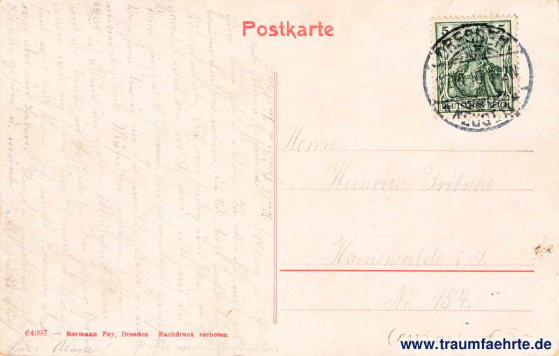 – Details – Year: ca. 1905 Postal state: postally used 1910 Inscription front: Dresden. Partie am Zwingerteich. Inscription back: Postkarte, 64097 – Hermann Poy, Dresden, Nachdruck verboten Postmark(s): Dresden-Neust. [11], 27.10.10 1–2N Please note: