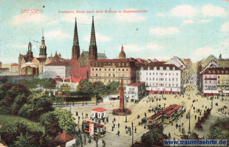 farbig – Platz und Wilsdruffer Straße mit Brunnen, Straßenbahnen, Häuschen und Passanten, Sophienkirche, im Hintergrund Türme von Hofkirche und Schloss sowie Kuppel und Turm der Frauenkirche