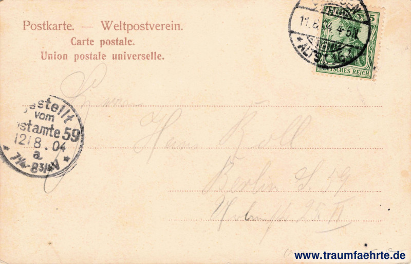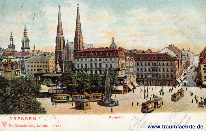 – Details – Jahr: ca. 1900 Status: gelaufen 1904 Beschriftung vorne: Dresden, Postplatz, DTCo Dr. Trenkler Co., Leipzig. 18863, Waren-Abzahlungsgeschäft.,… Beschriftung hinten: Postkarte. – Weltpostverein. Carte postale. Union postale universelle. Stempel: Dresden-Altst. 16, [i], 11.8.04. 4–5N.; Bestellt vom Postamte 59, 12/8 . 04, a Hinweis: