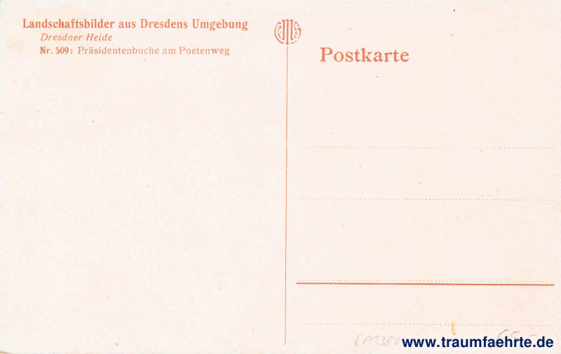 – Details – Jahr: ca. 1925 Status: ungelaufen Beschriftung vorne: kein Text Beschriftung hinten: Postkarte, Landschaftsbilder aus Dresdens Umgebung, Dresdner Heide, Nr. 509: Präsidentenbuche am Poetenweg Stempel: keine Hinweis: