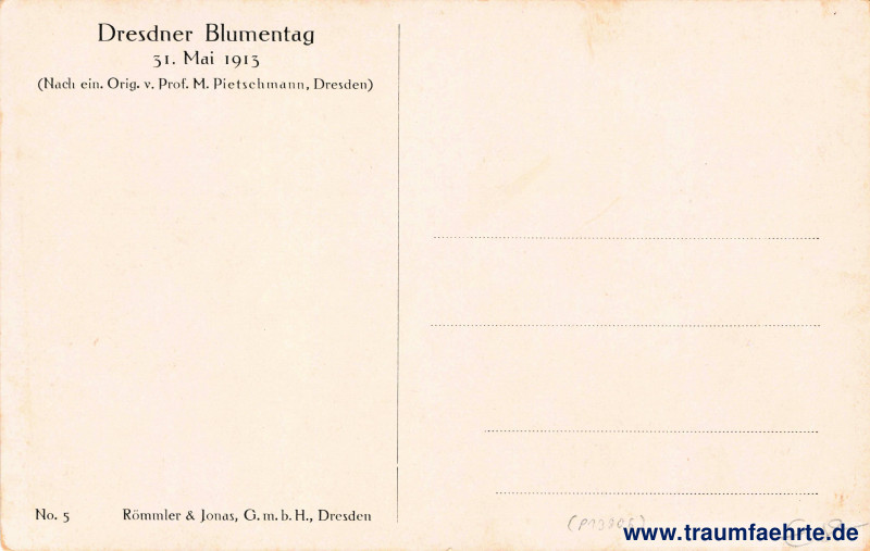 – Details – Year: 1913 Postal state: postally unused Inscription front: no text Inscription back: Dresdner Blumentag, 31. Mai 1913 (Nach ein. Orig. v. Prof. M. Pietschmann, Dresden), No. 5, Römmler & Jonas, G.m.b.H., Dresden Postmark(s): none Please note: