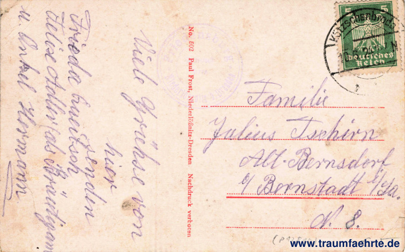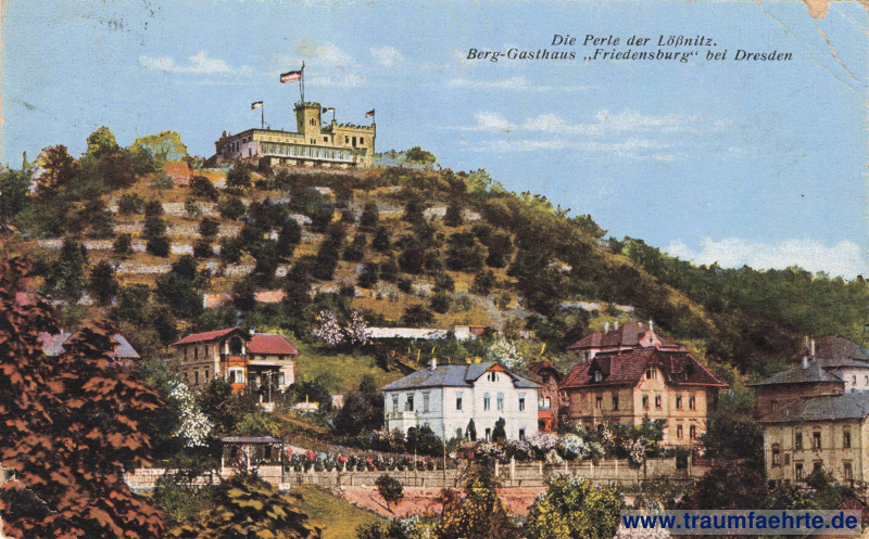 – Details – Year: ca. 1920 Postal state: postally used 1924 Inscription front: Die Perle der Lößnitz. Berg-Gasthaus „Friedensburg“ bei Dresden Inscription back: No. 502 Paul Frost, Niederlößnitz-Dresden, Nachdruck verboten Postmark(s): Kötzschenbroda, […], 10.5.24 2–3N; Friedensburg, Niederlössnitz b. Dresden, Sächsische Nizza Please note: