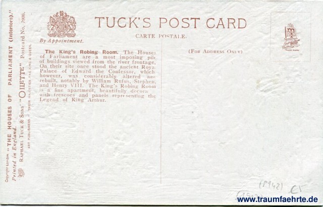 – Details – Jahr: ca. 1910 Status: ungelaufen Beschriftung vorne: The King's Robing Room, Houses of Parliament. Charles F. Flower, Oilette Beschriftung hinten: Tuck's Post Card, Carte Postale, By Appointment, The King's Robing Room. The Houses of Parliament are most imposing pile of buildings viewed from the river frontage, On their site once stood the ancient Royal Palace of Edward the Confessor, which however, was considerably altered and rebuilt, notably by William Rufus, Stephen and Henry VII. The King's Robing Room is a fine apartment, beautifully decora[ted] with frescoes and panels representing the Legend of King Arthur. (For Address Only), R&S T, Raphael House, Trade Mark, Copyright London, Printed in England, The Houses of Parliament (Interiors). R&T S Raphael Tuck & Sons' Oilette Postcard No. 7906, Art Publishers to Their Majesties the King & Queen. Stempel: keine Hinweis: