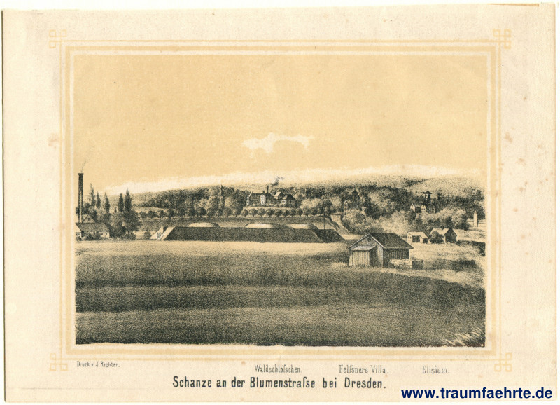 Beschriftung: Schanze an der Blumenstraße bei Dresden. Waldschlößchen. Felssners Villa. Elisium. Druck v. J. Richter.
