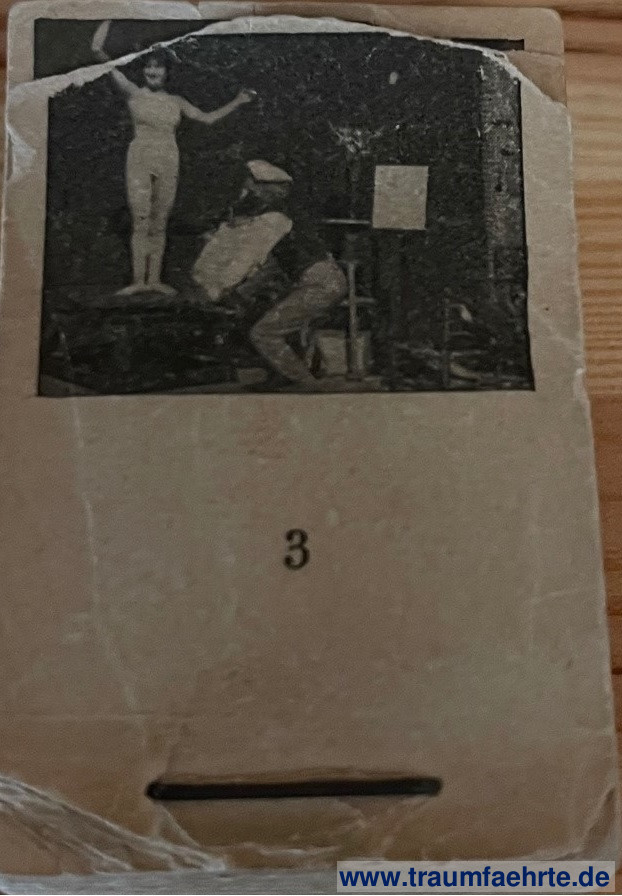 Alte Bücher etc. > Fotografie > VerschiedenesDaumenkino (Thaumatograph). Ohne Titel (Der Künstler und sein Modell – je nach dem wie man das Daumenkino blättert, hilft der Künstler seinem Modell beim vollständigen Aus- oder Ankleiden). [ Permalink ]>>> Artikel-Nr: 14408 <<< ohne Angaben ca. 1910, 75 (von 78?) Blatt mit fotografischen Abbildungen dieser Episode, 6 x 4 cm, seltenes frühes Fingerkino Zustand: es fehlen wsl. 3 Blatt, erste und letzte Seiten mit kleinen Randverlusten Preis: 200,00 €