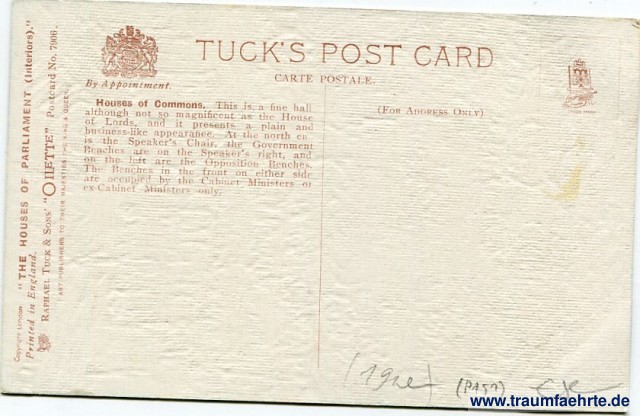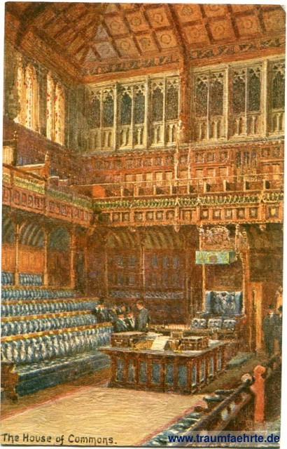 – Details – Jahr: ca. 1910 Status: ungelaufen Beschriftung vorne: The House of Commons. Charles F. Flower, Oilette Beschriftung hinten: Tuck's Post Card, Carte Postale, By Appointment, Houses of Commons. This is a fine hall although not so magnificent as the House of Lords, and it presents a plain and business-like appearance. At the north end is the Speaker's Chair, the Government Benches are on the Speaker's right, and on the left are the Opposition Benches. The Benches in the front on either side are occupied by the Cabinet Ministers or ex-Cabinet ministers only. (For Address Only), R&S T, Raphael House, Trade Mark, Copyright London, Printed in England, The Houses of Parliament (Interiors). R&T S Raphael Tuck & Sons' Oilette Postcard No. 7906 .Art Publishers to Their Majesties the King & Queen. Stempel: keine Hinweis: