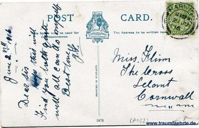– Details – Jahr: ca. 1915 Status: gelaufen 1916 Beschriftung vorne: Harbour & Great Eastern Hotel. Harwich. Beschriftung hinten: Post Card. Dainty Series. E T. W Dennis & Sons Ltd, London & ScarboroughThis Space may be used for Correspondence. The Address to be written here. Printed in England. 2474 Stempel: Harwich, 2 Jul 16, 8.30PM Hinweis: