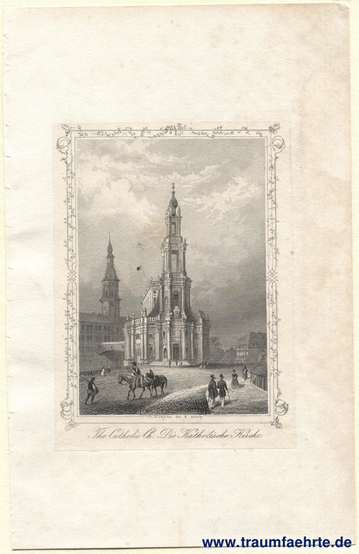 Original: Stahlstich – Hofkirche mit Schlossturm im Hintergrund, davor Passanten und Reiter mit Pferden