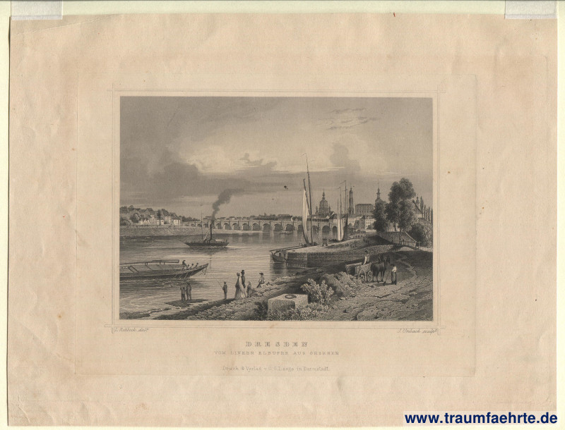 Schlagworte: Elbe, Flüsse, Dampfschiffe, Brücken, Kirchen, Schlösser, Türme, Kuppelbauten, Panorama, Stahlstiche