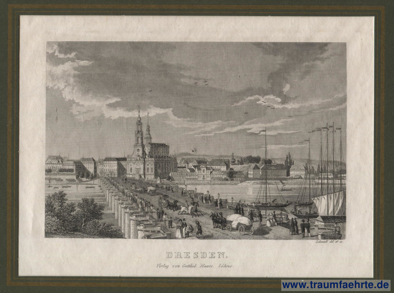 original steel engraving – Augustusbrücke bridge with fence, lanterns, horse-drawn vehicles, and pedestrians; Elbe / Labe river with boats; panorama of Dresden old town with Dresden cathedral and Dresden castle in the background