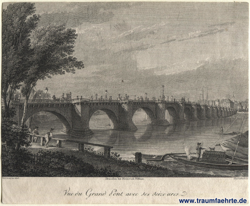 Beschriftung: Vue du Grand pont avec des seize arcs. Dresden bei Heinrich Rittner. Chormayer del. Darnstedt fc.