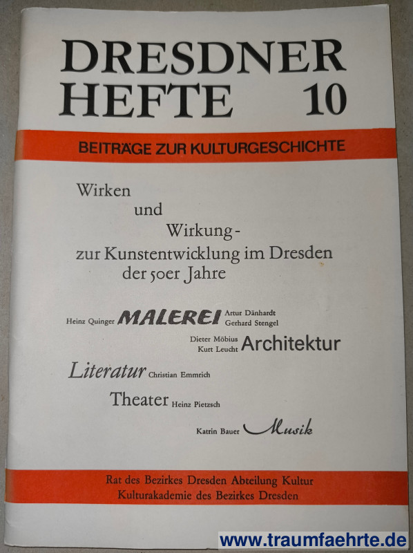 Alte Bücher etc. > SachsenRat des Bezirkes Dresden (Hrsg.): Dresdner Hefte 10. Beiträge zur Kulturgeschichte. Wirken und Wirkung – zur Kunstentwicklung im Dresden der 50er Jahre. [ Permalink ]>>> Artikel-Nr: 19142 <<< Dresden, Rat des Bezirkes 1986, mit Abbildungen, 80 S., illustr. OBro. Zustand: ordentliches Exemplar Preis: 7,00 €