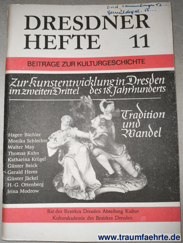 Alte Bücher etc. > SachsenRat des Bezirkes Dresden (Hrsg.): Dresdner Hefte 11. Zur Kunstentwicklung in Dresden im zweiten Drittel des. 18. Jahrhunderts. [ Permalink ]>>> Artikel-Nr: 19231 <<< Dresden, Rat des Bezirkes 1987, mit Abbildungen, 88 S., illustr. OBro. Zustand: ordentliches Exemplar Preis: 5,00 €