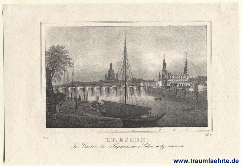 original lithography – view from Palaisgarten (palace garden) onto the old town with Frauenkirche church, Dresden cathedral, and castle tower; Elbe / Labe river with Augustusbrücke bridge, boats, and sailing ships; huts in front on the left