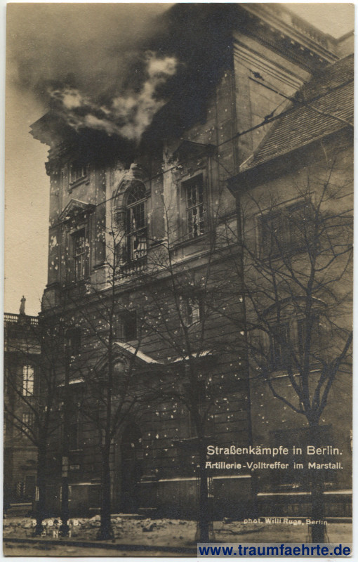 Beschriftung vorne: Straßenkämpfe in Berlin. Artillerie-Volltreffer im Marstall. phot. Willi Ruge, Berlin.
