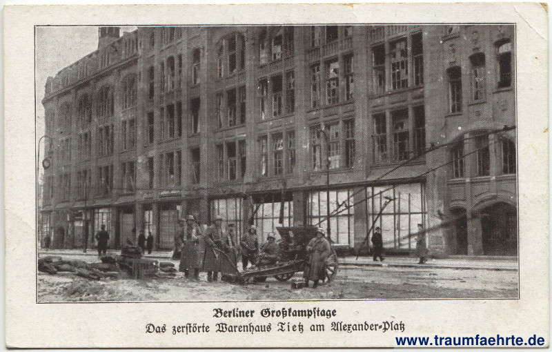 Beschriftung vorne: Berliner Großkampftage. Das zerstörte Warenhaus Tietz am Alexander-Platz.