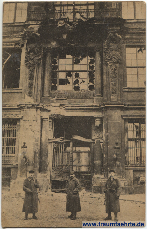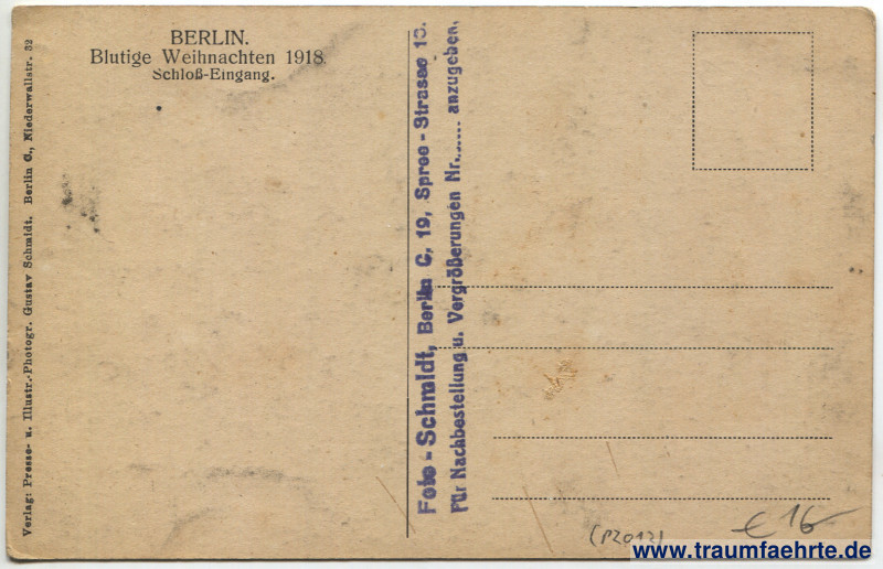 – Details – Year: 1918/19 Postal state: postally unused Inscription front: no text Inscription back: Berlin. Blutige Weihnachten 1918. Schloß-Eingang. Verlag: Presse- u. Illustr.-Photogr. Gustav Schmidt. Berlin C., Niederwallstr. 32. Postmark(s): Foto-Schmidt, Berlin C. 19, Spree-Strrasse 13. Für Nachbestellungen u. Vergrößerungen Nr. … anzugeben. Please note: